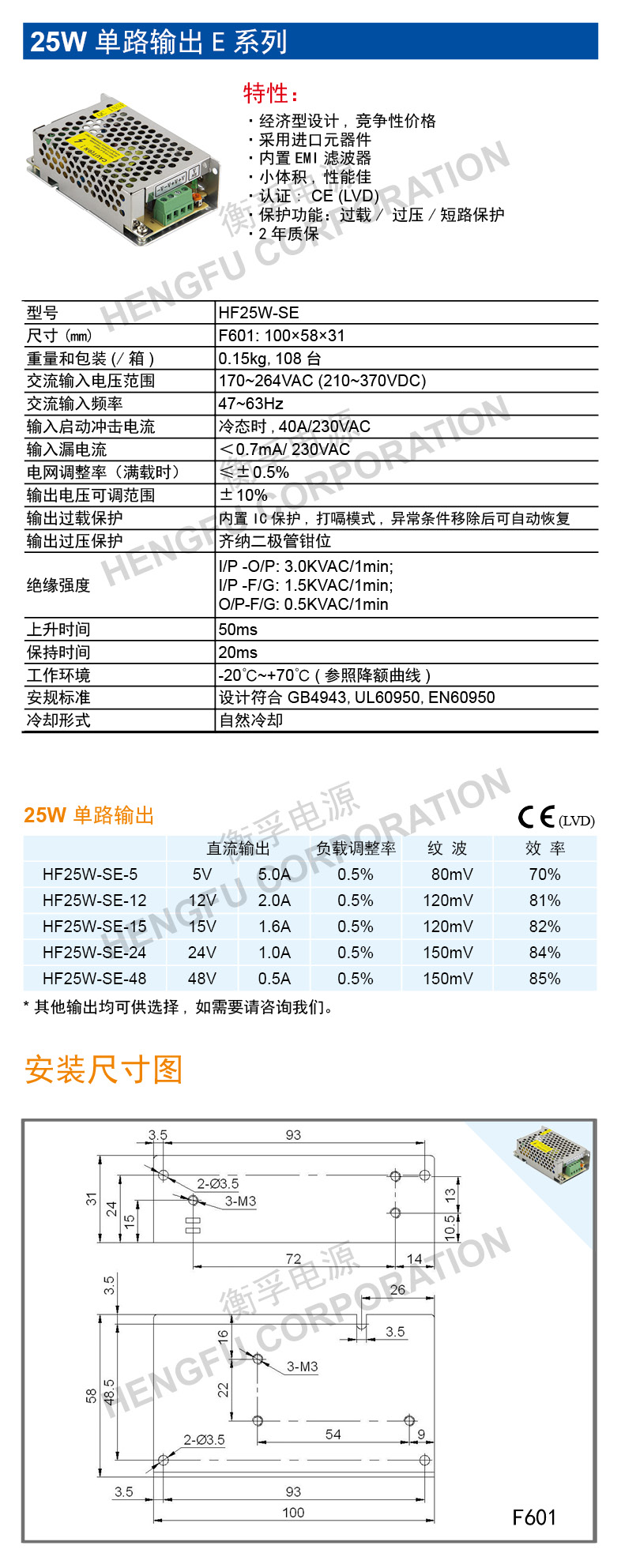 产品系列: E系列-经济型 输出组数: Single(单路) 认证: 产品型号: HF25W-SE 输入电压: 170-264 尺寸: 100*58*31 (mm) 功率(W): 25 输出电压: 5,12,15,24,48 保修: 2